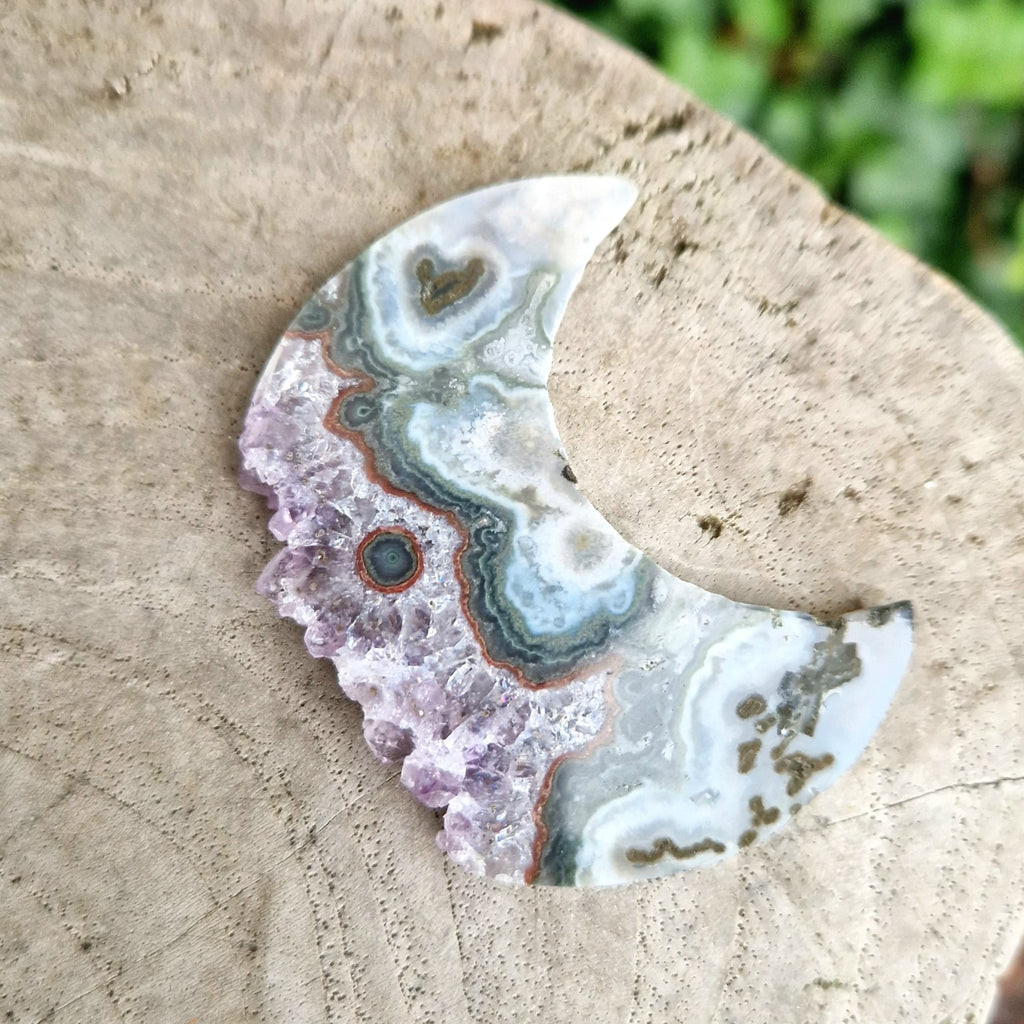Månarna är tillverkade av skivor av agat och ametist där man kan se agatens vackra mönster och ametistens fina kristaller. Du får månen på bilderna som visar fram- och baksida. (lägg märke till hjärtat nära översta spetsen)