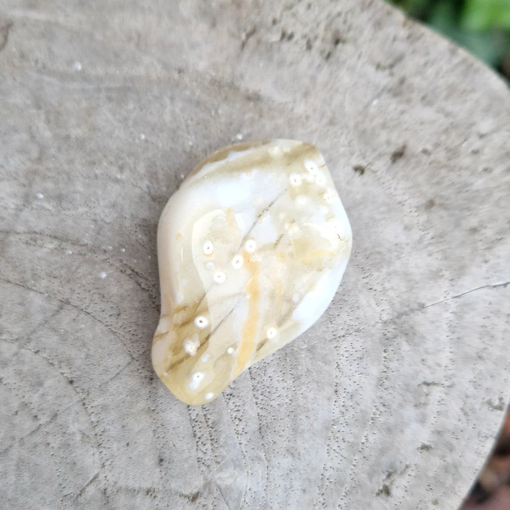 Vackert randig trumlad vit opal från Peru. Du får stenen på bilderna som visar fram- och baksida.